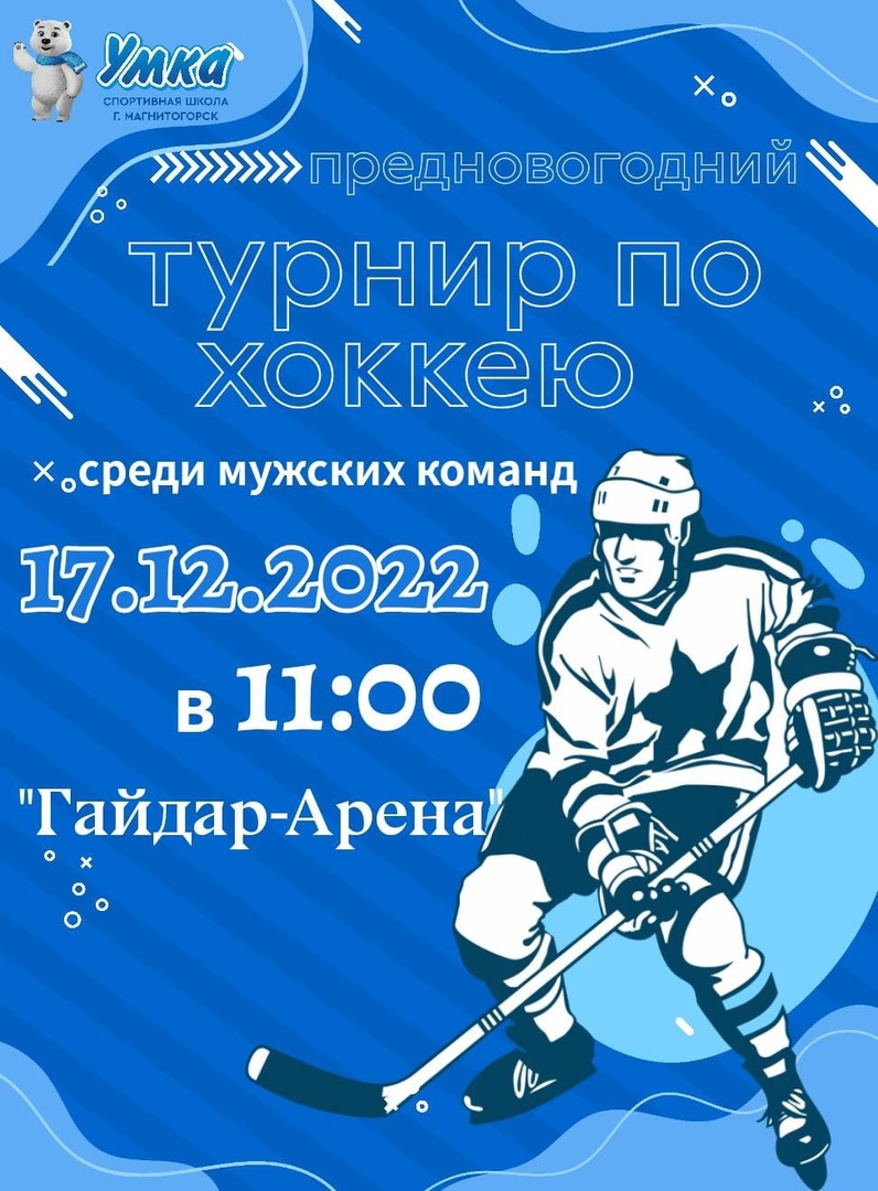10 декабря на "Гайдар-Арене" (ул. Панькова 20/1) состоится Предновогодний турнир по хоккею среди мужских команд.