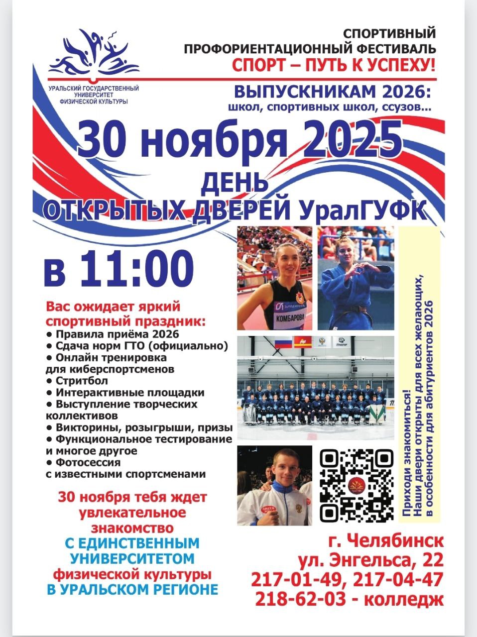 В учебно-тренировочном комплексе «Манеж» Уральского государственного университета физической культуры (г. Челябинск, ул. Энгельса, 22) 30 ноября 2025 года в 11:00 состоится День открытых дверей УралГУФК